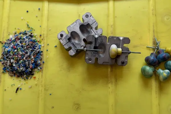 Dan begint het maken. We vermalen het plastic tot kleurrijk granulaat, verhitten het en geven het een nieuwe vorm. We experimenteren met kleuren en structuren en ontdekken steeds opnieuw wat mogelijk is. Afval verandert hier in onze grondstof.