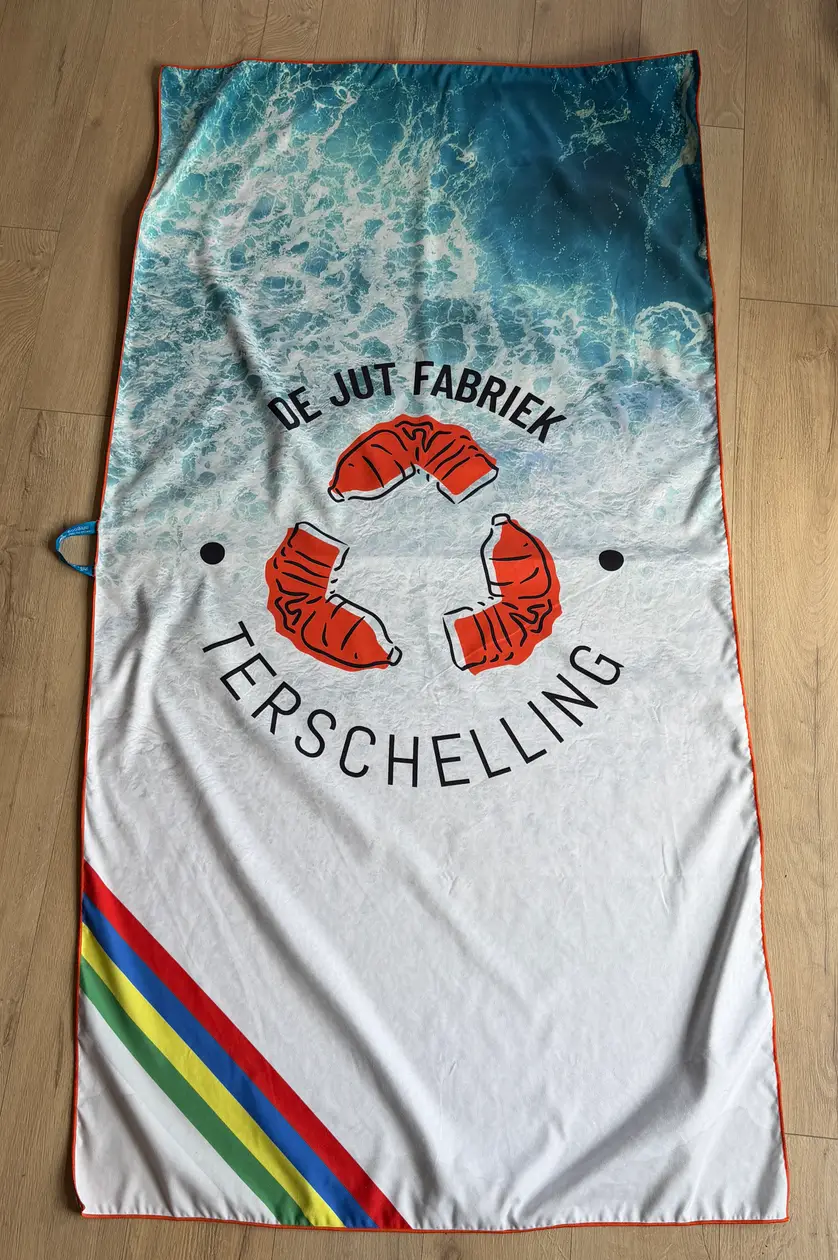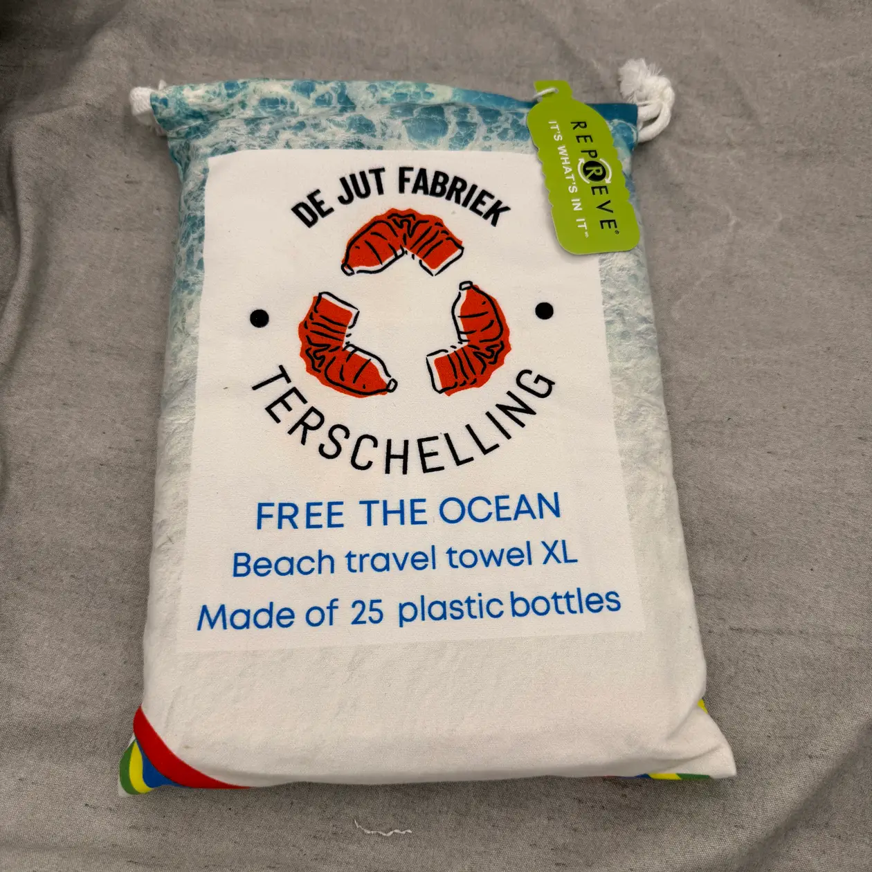 Jutfabriek handdoek gemaakt door SooBluu van 25 petflessen. Afmeting: 1,90m lang, 1,00m breed.